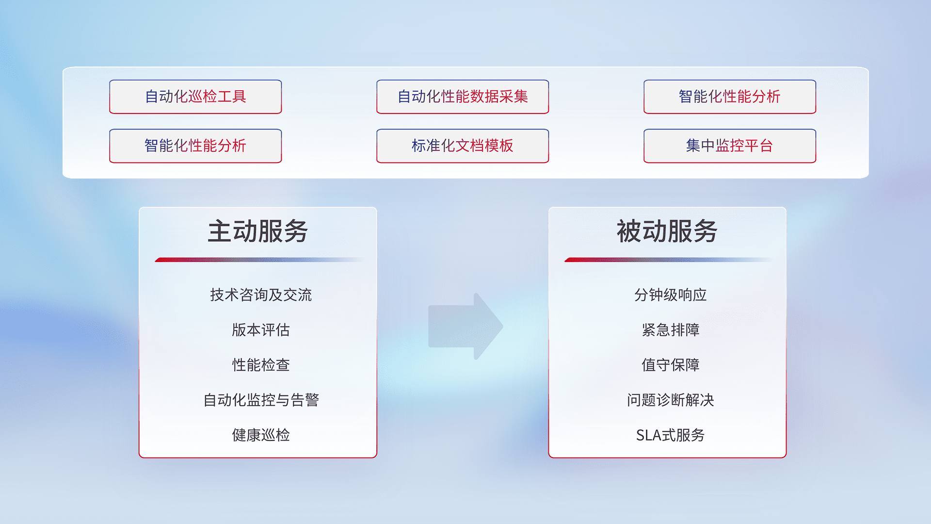 智能化工具和标准化文档,,保障服务质量,,提供主动服务(包含技术咨询、、版本评估、、、、性能检查、、、自动化监控与告警、、、、健康巡检)和被动服务包含(分钟级响应、、、、紧急排障、、、、值守保障、、问题诊断解决、、、、SLA服务)。。